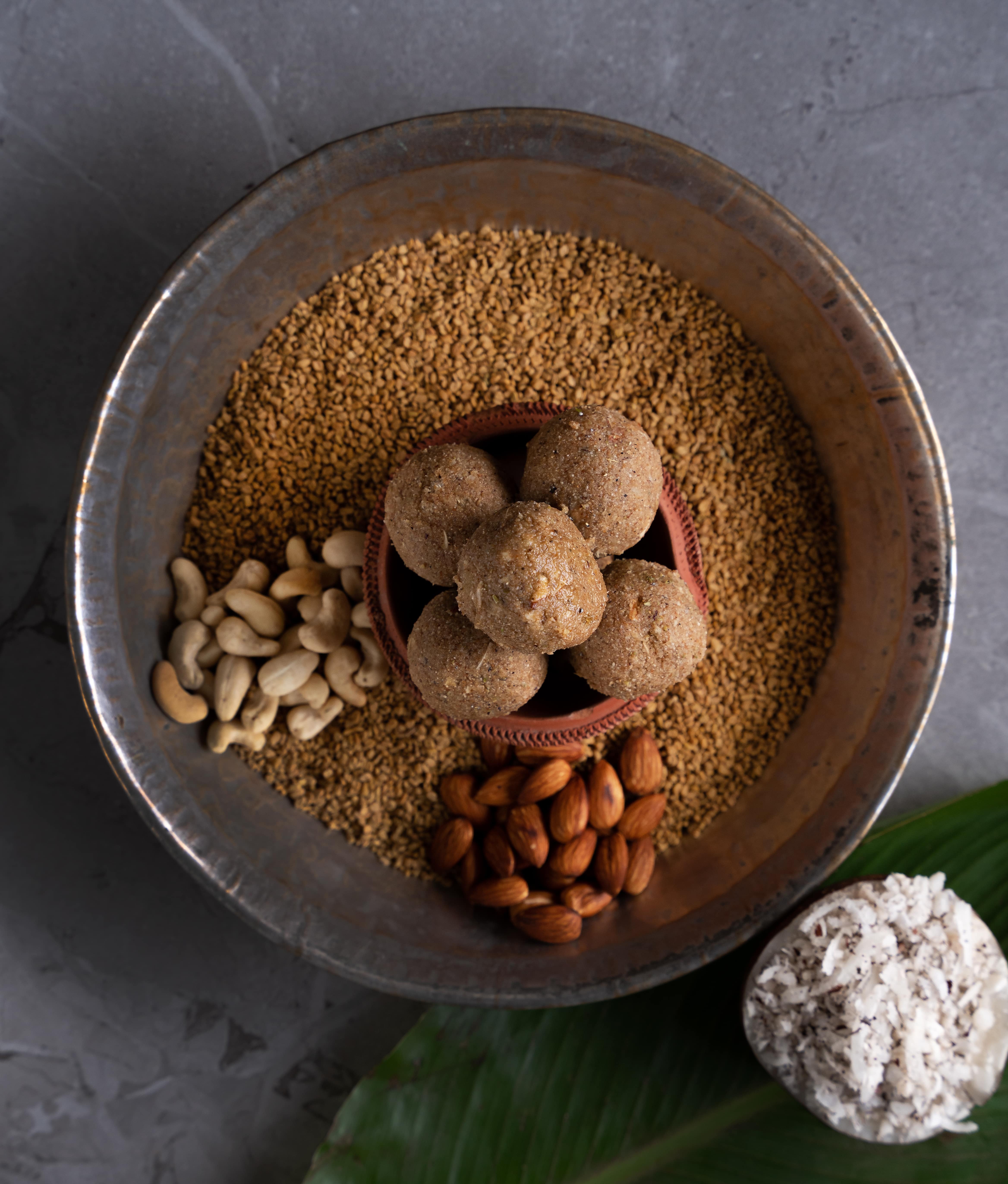 Ingredients- Wheat (aata), Mishri/Jaggery/Sugar-Free, Ghee, Coconut (Gola), Fenugreek Seeds (Dana Methi), Cashew (Kaju), Gond, Almond (Badam), Black Pepper (Kalimirch)