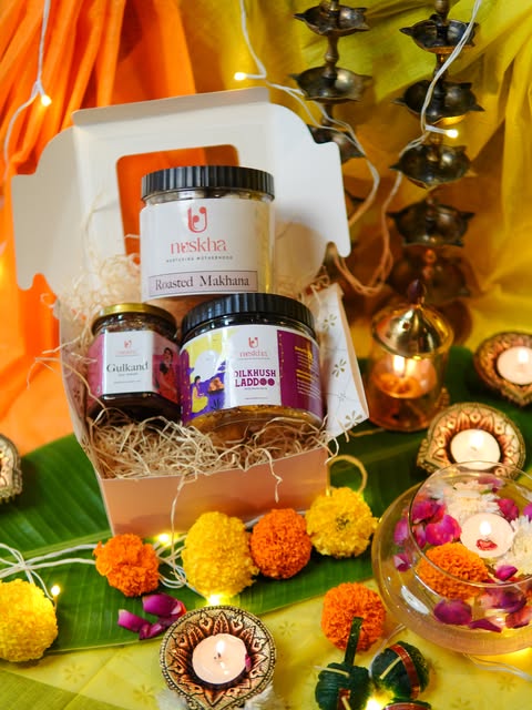It includes Roasted Makhana (100 g) for light snacking, Rose Gulkand for cooling digestion, and Dilkhush Laddu (400 g) made with pure ingredients for strength and immunity.